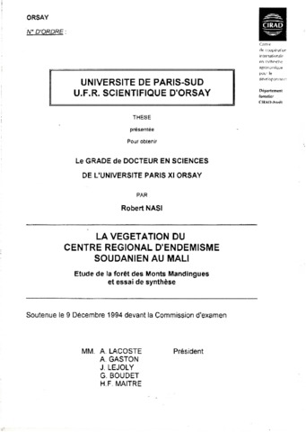Nasi Robert. 1994. La végétation du centre régional d'endémisme soudanien au Mali : étude de la forêt des Monts Mandingues et essai de synthèse. Orsay : Université de Paris-Sud, 332 p. Thèse de doctorat : Sciences : Université de Paris-Sud