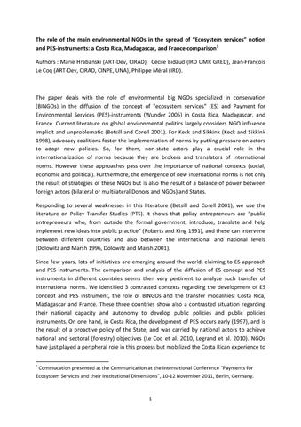 2011. The role of the main environmental NGOs in the spread of "Ecosystem services" notion and PES�-instruments: a Costa Rica, Madagascar, and France comparison.