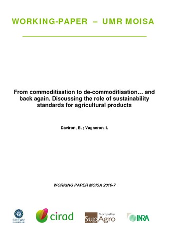 Daviron Benoit, Vagneron Isabelle. 2010. From commoditisation to de-commoditisation and back again. Discussing the role of sustainability standards for agricultural products : working paper Moisa. Montpellier : CIRAD, 34 p.