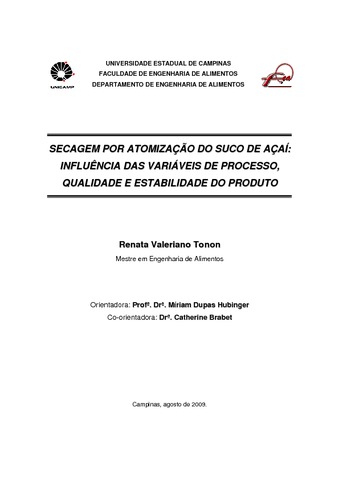 Tonon Renata Valeriano. 2009. Secagem por atomização do suco de açaí: influência das variáveis de processo, qualidade e estabilidade do produto. Campinas : UNICAMP, 203 p. Dissertaçao Mestre : Universidade Estadual de Campinas