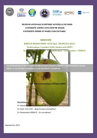 Ndoye Soukeye. 2011. Les écosystèmes hôtes potentiels de Bactrocera invadens (Drew et al) (Dipteria) en saison sèche : le cas des bas fond dans la zone des Niayes du Sénégal. Paris : MNHN, 43 p. Mémoire de master 2 : Biodiversité végétale tropicale (BVT) : Muséum national d'histoire naturelle
