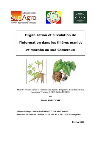 Tricoche Benoît. 2008. Organisation et circulation de l'information dans les filières manioc et macabo au Sud Cameroun. Montpellier : Montpellier SupAgro, 187 p. Mémoire d'ingénieur : Agronomie Tropicale. ECODEV : Montpellier SupAgro Centre international d'études supérieures en sciences agronomiques