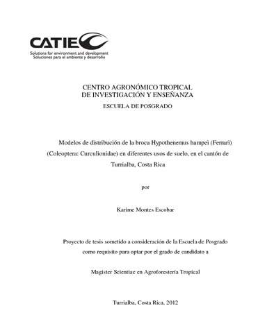 Montes Escobar Karime. 2012. Modelos de distribución de la broca Hypothenemus hampei (Ferrari) (Coleoptera: Curculionidae) en diferentes usos de suelo, en el cantón de Turrialba, Costa Rica. Turrialba : CATIE, 92 p. Tesis Magister : Scientiae. Agroforestería tropical : Centro Agronomico Tropical de Investigacion y Ensenanza