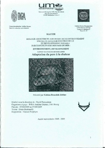 Bensalaheddine Kahina. 2009. Adaptation du porc à la chaleur. Montpellier : UM2, 40 p. Mémoire de master 2 : Élevages des pays du Sud, environnement et développement. Ecologie fonctionelle et développement durable : Université Montpellier 2