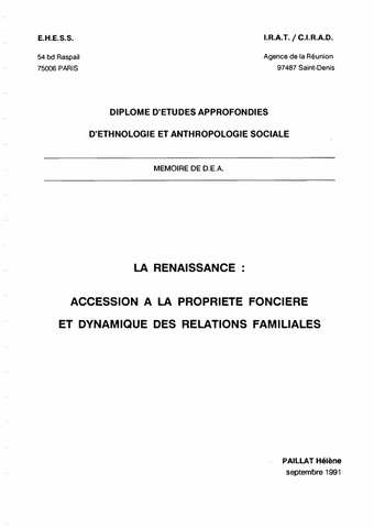 Paillat Hélène. 1991. La renaissance : accession à la propriété foncière et dynamique des relations familiales. Paris : EHESS, 82 p. Mémoire DEA : Ethnologie et antrhopologie sociale : Ecole des hautes études en sciences sociales