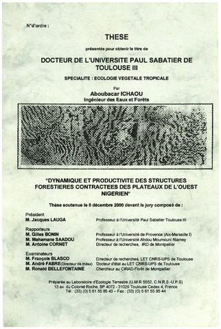 Ichaou Aboubacar. 2000. Dynamique et productivité des structures forestières contractées des plateaux de l'Ouest nigérien. Toulouse : Université Paul Sabatier, 231 p. Thèse de doctorat : Ecologie végétale tropicale : Université Paul Sabatier