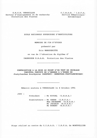 Margueritte Eric. 1991. Contribution à la mise au point d'un test de criblage variétal précoce de l'ananas à l'égard de Pratylenchus brachyurus (Godfrey) (Nematoda-Pratylenchidae). Versailles : ENSH, 50 p. Mémoire de fin d'études : Protection des plantes : Ecole nationale supérieure d'horticulture