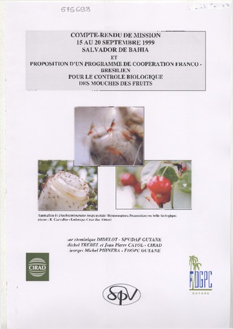 Didelot Dominique, Trébel Michel, Cayol Jean-Pierre, Phinera Georges Michel. 1999. Compte-rendu de mission 15 au 20 septembre 1999, Salvador de Bahia et proposition d'un programme de coopération franco-brésilien pour le contrôle biologique des mouches des fruits. s.l. : CIRAD, 17 p.