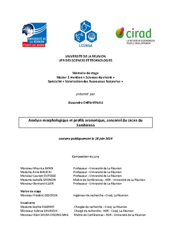 Chen-Yen-Su Alexandre. 2014. Analyse morphologique et profils aromatique, sensoriel du cacao du Sambirano. Saint-Denis : Université de la Réunion, 81 p. Mémoire de master 2 : Sciences du vivant. Valorisation des ressources naturelles : Université de la Réunion