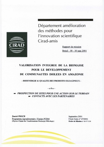 Pioch Daniel. 2001. Valorisation intégrée de la biomasse pour le développement de communautés isolées en Amazonie. Bioénergie et qualité des produits oléagineux. Brésil : 18-30 juin 2001. Montpellier : CIRAD-AMIS, 61 p.