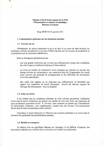 Bertaux Serge. 2001. Mécanisation et stations d'emballage - Bananes et ananas. Mission Côte d'Ivoire auprès de la SCB. s.l. : CIRAD, 12 p.