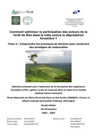 Kübler Daniel. 2007. Comment optimiser la participation des acteurs de la forêt de Mau dans la lutte contre la dégradation forestière ? Comprendre les processus de décision pour construire des stratégies de restauration. Montpellier : ENGREF, 59 p. Mémoire FIF : Formation rurale et tropicale : Ecole nationale du génie rural, des eaux et des forêts