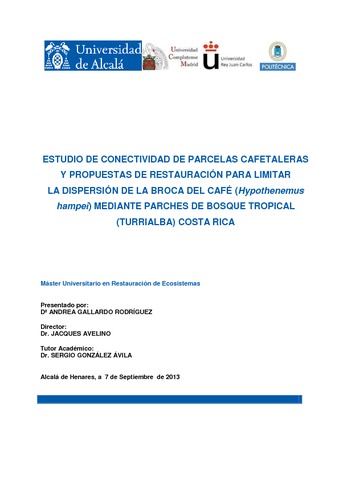 Gallardo Rodriguez Andrea. 2013. Estudio de conectividad de parcelas cafetaleras y propuestas de restauración para limitar la dispersión de la broca del café (Hypothenemus hampei) mediante parches de bosque tropical (Turrialba) Costa Rica. Alcalá de Henares : Universidad Politecnica de Madrid, 51 p. Mémoire de master : Restauración de Ecosistemas : Universidad Politecnica de Madrid