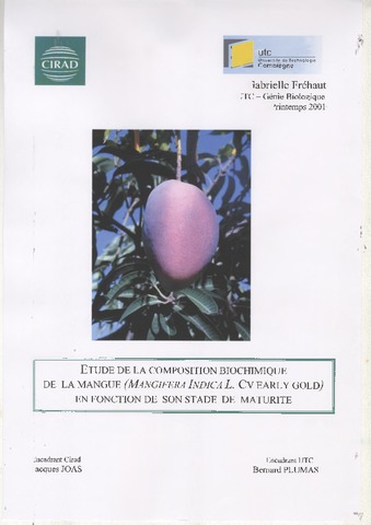 Fréhaut Gabrielle. 2001. Étude de la composition biochimique de la mangue (Mangifera Indica L. Cv early gold) en fonction de son stade de maturité. Compiègne : UTC, 65 p. Mémoire de fin d'études : Génie Biologique : Université technologique de Compiègne