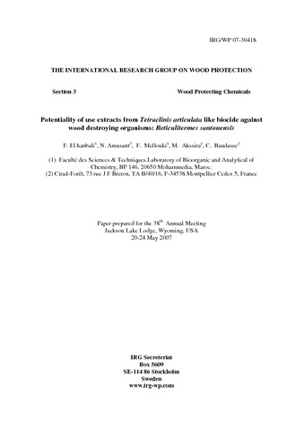 2007. Potentiality of use extracts from Tetraclinis articulata like biocide against wood destroying organisms: Reticulitermes santonensis.
