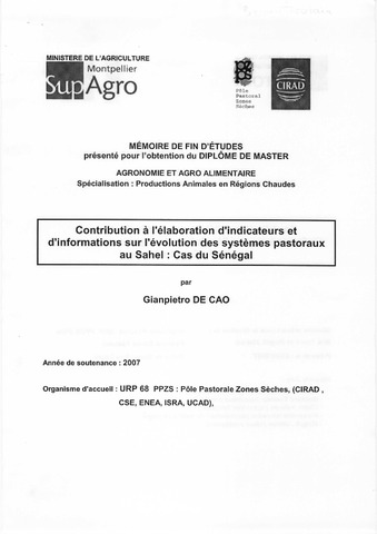 De Cao Gianpietro. 2007. Contribution à l'élaboration d'indicateurs et d'informations sur l'évolution des systèmes pastoraux au Sahel : cas du Sénégal. Montpellier : Montpellier SupAgro, 59 p. Mémoire de fin d'études : Agronomie et Agroalimentaire. Productions Animales en Régions Chaudes : Montpellier SupAgro Centre international d'études supérieures en sciences agronomiques