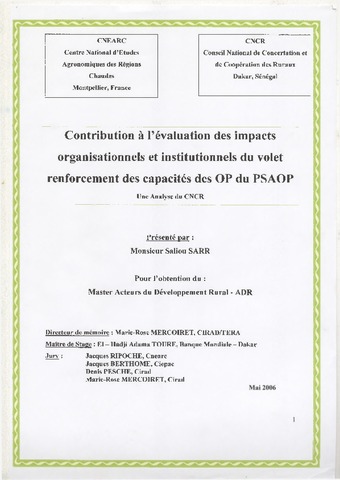 Sarr Saliou. 2006. Contribution à l'évaluation des impacts organisationnels et institutionnels du volet renforcement des capacités des OP du PSAOP : une analyse du CNCR. Montpellier : CNEARC, 122 p. Mémoire de master : Acteur du développement rural : Centre national d'études agronomiques des régions chaudes