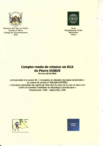 Dubus Pierre. 2005. Compte-rendu de mission en RCA de Pierre Dubus du 4 au 18/12/2005. Montpellier : CIRAD-Forêt, 8 p.