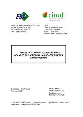Garrido Alexia. 2010. Effets de l'ombrage sur la rouille orangée du caféier via la caractérisation du microclimat. Angers : ESA, 60 p. Mémoire de fin d'études : Ecole supérieure d'agriculture d'Angers