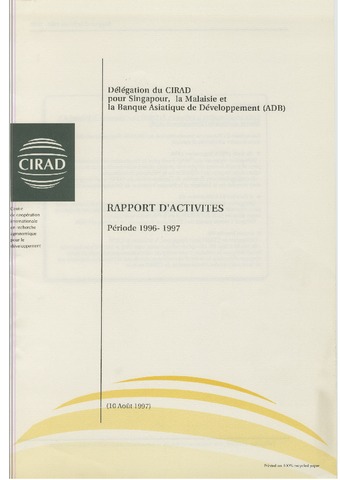 CIRAD - FRA. 1997. Rapport d'activités Période 1996- 1997. Délégation du CIRAD pour Singapour, la Malaisie et la Banque Asiatique de Développement (ADB).. Montpellier : CIRAD, 12 p.