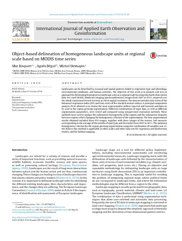 Bisquert Mar, Bégué Agnès, Deshayes Michel. 2015. Object-based delineation of homogeneous landscape units at regional scale based on MODIS time series. International Journal of Applied Earth Observation and Geoinformation, 37 : 72-82.