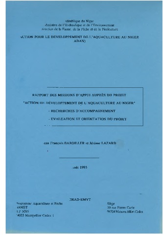 Baroiller Jean-François, Lazard Jérôme. 1993. Rapport des missions d'appui auprès du projet Action de développement de l'aquaculture au Niger. Recherches d'accompagnement. Evaluation et orientation du projet. Maisons-Alfort : CIRAD-EMVT, 25 p.