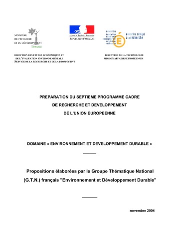 In : Préparation du septième programme cadre de recherche et développement de l'union européenne. Domaine « Environnement et développement durable ». Propositions élaborées par le Groupe Thématique National (G.T.N.) français "Environnement et Développement D. MEDD, MENESR