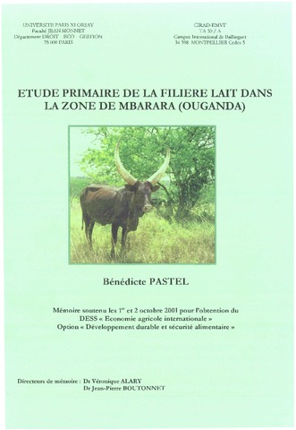 Pastel Bénédicte. 2001. Etude primaire de la filière lait dans la zone de Mbarara (Ouganda). Montpellier : Université Paris-Sud-CIRAD-EMVT, 113 p. Mémoire DESS : Economie agricole internationale. Option Développement durable et sécurité alimentaire : Université Paris-Sud