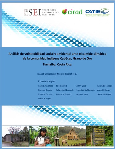 Gutiérrez Isabel, Sibelet Nicole, Alvarado Yaneth, Chavez Isis, Díaz Jeffry, Escarraga Laura, García Carmen, Huacash Sebastián, Maldonado Lourdes, Moran Juan C., Orozco Ricardo, Osorio Angelica, Reyna Jesua, Rojas Nazareth, Ugaz María R.. 2016. Análisis de vulnerabilidad social y ambiental ante el cambio climático de la comunidad indígena Cabécar, Grano de Oro, Turrialba, Costa Rica. Turrialba : CIRAD-CATIE, 46 p.