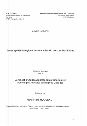 Mougenot Anne-Flore. 2003. Etude épidémiologique des maladies du porc en Martinique. Toulouse : ENVT, 78 p. Mémoire CEAV : Pathologie animale en régions chaudes : ENVT