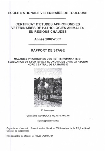 Kondolas Oualybangah Guillaume. 2003. Maladies prioritaires des petits ruminants et évaluation de leur impact économique dans la région nord central de la Namibie. Toulouse : Ecole nationale vétérinaire de Toulouse, 69 p. Mémoire CEAV : Pathologie animale en régions chaudes : ENVT