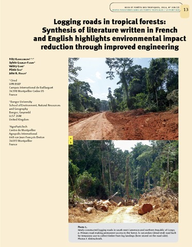 Kleinschroth Fritz, Gourlet-Fleury Sylvie, Gond Valéry, Sist Plinio, Healey John R.. 2016. Logging roads in tropical forests: synthesis of literature written in French and English highlights environmental impact reduction through improved engineering. Bois et Forêts des Tropiques (328) : 13-26.