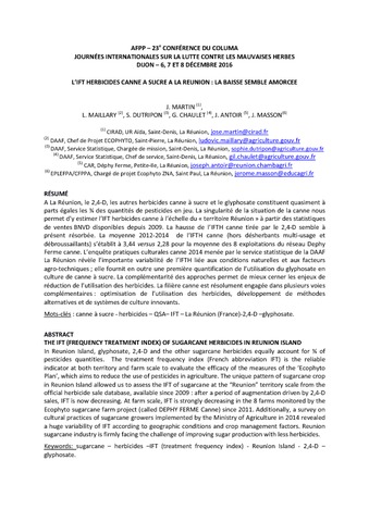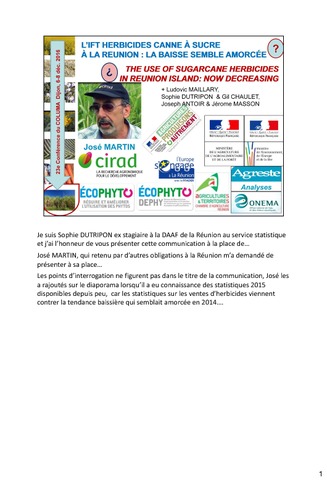 Résumé (autre langue) : In Reunion Island, glyphosate, 2,4-D and the other sugarcane herbicides equally account for ¾ of pesticides quantities. The treatment frequency index (French abbreviation IFT) is the reliable indicator at both territory and farm scale to evaluate the efficacy of the measures of the 'Ecophyto Plan', which aims to reduce the use of pesticides in agriculture. The unique pattern of sugarcane cropin Reunion Island allowed us to assess the IFT of sugarcane at the “Reunion” territory scale from the official herbicide sale database, available since 2009 : after a period of augmentation driven by 2,4-D sales, IFT is now decreasing. At farm scale, IFT is strongly decreasing in the 8 farms monitored by the Ecophyto sugarcane farm project (called DEPHY FERME Canne) since 2011. Additionally, a survey on cultural practices of sugarcane growers implemented by the Ministry of Agriculture in 2014 revealed a huge variability of IFT according to geographic conditions and crop management factors. Reunion sugarcane industry is firmly facing the challenge of improving sugar production with less herbicides.
