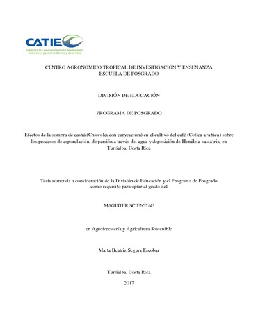Segura Escobar Marta Beatriz. 2017. Efectos de la sombra de cashá (Chloroleucon eurycyclum) en el cultivo del café (Coffea arabica) sobre los procesos de esporulación, dispersión a través del agua y deposición de Hemileia vastatrix, en Turrialba, Costa Rica. Turrialba : CATIE, 51 p. Magister scientiae : Agroforestería y agricultura sostenible : Centro Agronomico Tropical de Investigacion y Ensenanza