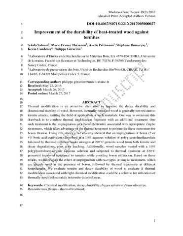 Utilisation soumise à autorisation de l'auteur ou du Cirad. Art. 27 Improvement of the durability of heat-treated wood against termites.pdf Télécharger (537kB) | Prévisualisation |