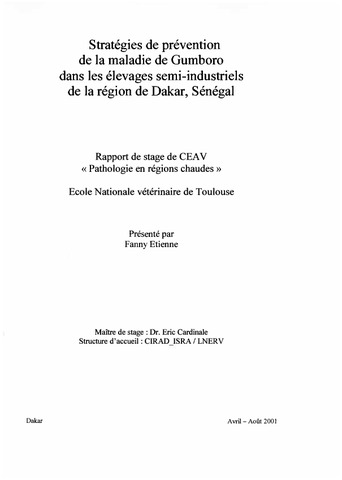 Etienne Fanny. 2001. Stratégies de prévention de la maladie de Gumboro dans les élevages semi-industriels de la région de Dakar, Sénégal. Toulouse : ENVT, 72 p. Mémoire CEAV : Pathologie en régions chaudes : ENVT