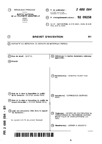Cornuejols Georges Marc. 1997. Dispositif de détection de défauts de matériaux fibreux. Paris : INPI, 21 p. N° de dépôt : 9209258, N° de brevet : FR2688064 B1, N° de brevet : US5598266 A