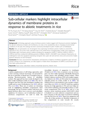 Huyen Chu Thi Thu, Hoang Thi Giang, Trinh Duy Chi, Bureau Charlotte, Meynard Donaldo, Vernet Aurore, Ingouff Mathieu, Do Vinh Nang, Périn Christophe, Guiderdoni Emmanuel, Gantet Pascal, Maurel Christophe, Luu Doan-Trung. 2018. Sub-cellular markers highlight intracellular dynamics of membrane proteins in response to abiotic treatments in rice. Rice, 11:23, 8 p.