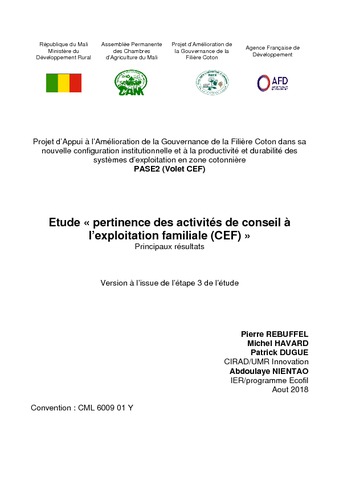 Rebuffel Pierre, Havard Michel, Dugué Patrick, Nientao Abdoulaye. 2018. Etude "Pertinence des activités de conseil à l'exploitation Familiale (CEF)" Principaux résultats. Projet PASE2 (Volet CEF). s.l. : AFD, 88 p.