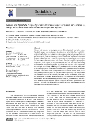 Wargui Rosine, Adandonon Appolinaire, Sinzogan Antonio Alain Coffi, Anato Florence M., Vayssières Jean-François, Kossou Dansou, Offenberg Joachim. 2018. Weaver ant Oecophylla longinoda Latreille (Hymenoptera: Formicidae) performance in mango and cashew trees under different management regimes. Sociobiology, 65 (2) : 208-214.