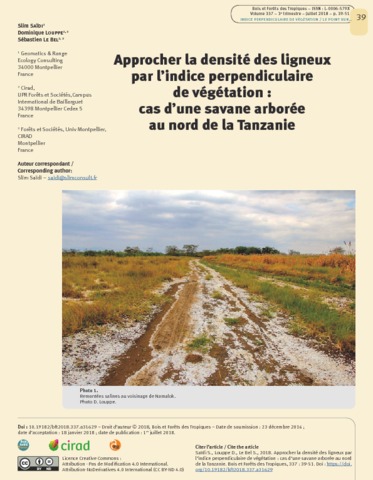Saïdi Slim, Louppe Dominique, Le Bel Sébastien. 2018. Approcher la densité des ligneux par l'indice perpendiculaire de végétation : cas d'une savane arborée au nord de la Tanzanie. Bois et Forêts des Tropiques, 337 : 39-51.