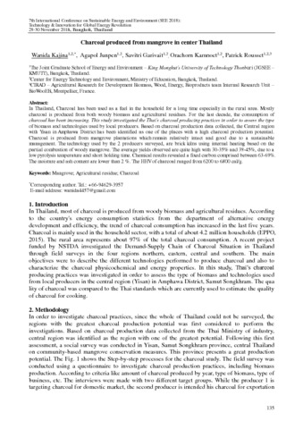 Résumé : In Thailand, Charcoal has been used as a fuel in the household for a long time especially in the rural area. Mostly charcoal is produced from both woody biomass and agricultural residues. For the last decade, the consumption of charcoal has been increasing. This study investigated the Thai's charcoal producing practices in order to assess the type of biomass and technologies used by local producers. Based on charcoal production data collected, the Central region with Yisan in Amphawa District has been identified as one of the places with a high charcoal production potential. Charcoal is produced from mangrove plantations which remain relatively intact and good due to a sustainable management. The technology used by the 2 producers surveyed, are brick kilns using internal heating based on the partial combustion of woody mangrove. The average yields observed are quite high with 30-35% and 38-45%, due to a low pyrolysis temperature and short holding time. Chemical results revealed a fixed carbon comprised between 63-69%. The moisture and ash content are lower than 2 %. The HHV of charcoal ranged from 6200 to 6800 cal/g.