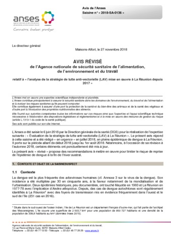 Baldet Thierry, Carnevale Pierre, Devillers James, Dupé Sandrine, Noël Harold, Roiz Pereda David. 2018. Avis du 31/07/2018 révisé le 23/10/2018 de l'Agence nationale de sécurité sanitaire de l'alimentation, de l'environnement et du travail (ANSES) relatif à " l'analyse de la stratégie de lutte anti-vectorielle (LAV) mise en oeuvre à La Réunion depuis 2017 ".. Maisons-Alfort : ANSES, 86 p.
