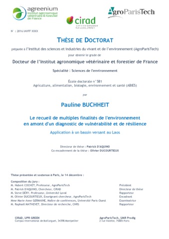 Buchheit Pauline. 2016. Le recueil de multiples finalités de l'environnement en amont d'un diagnostic de vulnérabilité et de résilience. Application à un bassin versant au Laos. Paris : AgroParisTech, 340 p. Thèse de doctorat : Science de l'environnement : AgroParisTech