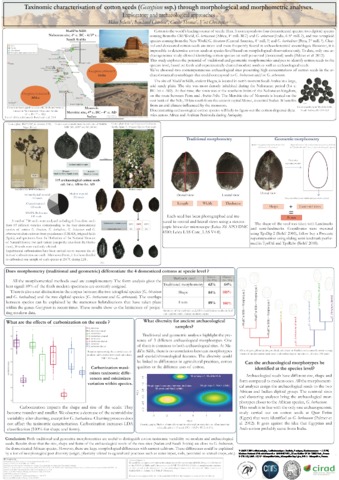 Résumé : Cotton (Gossypium sp.) includes four independently domesticated species: two diploid species, G. herbaceum in Africa and G. arboreum in the Indian subcontinent, and two tetraploid species, G. hirsutum in Central America and G. barbadense in Peru. The understanding of the diffusion history of these cottons is limited by the fact that the seeds, regularly found in archaeological context, cannot be determined at the rank of the species based solely on morphological observations. This study therefore explores the potential of morphometric, traditional and geometric analyses on modern seeds to extract a taxonomic signal that can be applied to archaeological material. The modern corpus is composed of varieties of the four domesticated species of cotton, cultivated in greenhouse (Montpellier, CIRAD) and in the field (Spain and Saudi Arabia). Specimens of herbarium seeds (MNHN) from the 19th and 20th centuries are also taken into account. The corpus is completed by archaeological seeds from the Sudanese site of Mouweis (Meroitic period, 1st-4/5th c. AD) and the Saudi site of Madâ'in Sâlih (Nabateo-Roman period, 1st-4/5th c. AD). Because of the conservation by carbonization of archaeological specimens, experimental carbonizations were carried out on modern seeds in order to evaluate the impact of carbonization on the shape of the seeds. The shape of the modern and archaeological seeds was captured using two approaches. (1) A log shape ratio of linear measurements (traditional morphometric analyses) and (2) an outline analyses with a sliding semi-Landmarks approach (geometric morphometric analyses). These approaches discriminate diploid species from tetraploid species and differentiate species within the modern corpus. Seed carbonization does not affect this taxonomic discrimination and seems, on the contrary, to maximize taxonomic differences. The comparative approach seems to approximate the archaeological seeds to the species G. herbaceum without however affirming it clearly. These data offer new hypotheses on the dynamics of cotton circulation in Africa and the Arabian Peninsula during Antiquity.