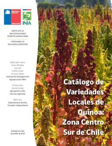 Ortega Fernando, Bazile Didier, Hinrichsen Patricio, Bierwirth Federico, Leon-Lobos Pedro, Morales Arturo, Ruf Kurt, Zurita Andrés, Alfaro Christian, Veas Enrique, Cortés Hernán, Jara Pablo. 2018. Catálogo de variedades locales de quínoa: zona centro sur de Chile. Santiago du Chili : INIA, 45 p.