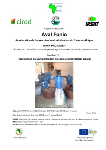 Ferré Thierry, Medah Ignace, Guindo Fanta, Cruz Jean-François. 2018. Entreprises de transformation du fonio et innovations au Mali. Projet n° AURG/2/161 Aval fonio.Livrable 18. Work Package 4. Processus d'innovation dans les petites agro-industries de transformation du fonio. Montpellier : CIRAD, 26 p.