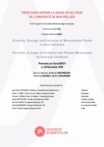 Bruy David. 2018. Diversité, écologie et évolution des plantes monocaules de Nouvelle-Calédonie. Montpellier : Université de Montpellier, 329 p. Thèse de doctorat : Ecologie fonctionnelle et sciences agronomiques : Université de Montpellier