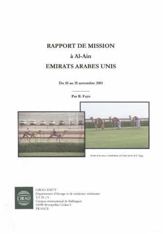 Faye Bernard. 2001. Rapport de mission à Al-Ain Emirats Arabes Unis. Du 10 au 15 novembre 2001. Montpellier : CIRAD-EMVT, 27 p.