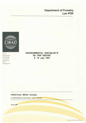 CIRAD-FORET - FRA. 1997. Department of forestry Lao PDR. Environmental specialist's 7th trip report 9-19 July 1997. Montpellier : CIRAD-FORET, 21 p.